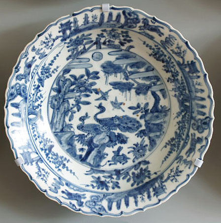 | Nederlands | Schotel met decor van 2 pauwen en haas in landschap, Swatow |