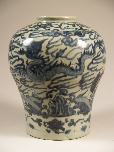 Balustervormige pot (voorraadpot) van porselein, beschilderd in onderglazuur blauw. Op de wand twee vliegende draken en ...t een band met bloemranken. Bakzand op de voetring. Zhangzhou (Swatow)||Zhangzhou||Keramiekmuseum Princessehof GRV 1929-049