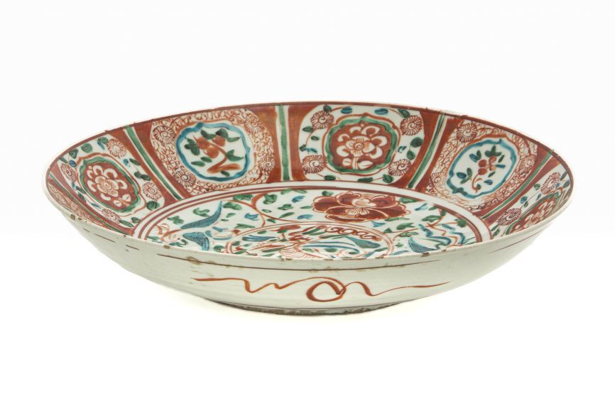 Schotel met decor van qilin omgeven door 2 feniksen en bloemranken, Swatow (Q25698)