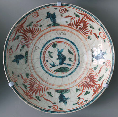 | Nederlands | Schotel met decor van opspringende karper omgeven door een band met karpers en vegetatie, Zhangzhou (Swatow) |
