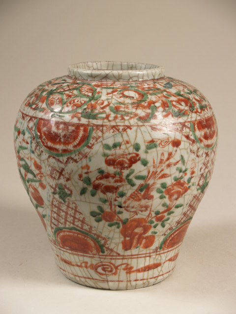 Balustervormige pot (voorraadpot) van porselein, beschilderd op het glazuur in blauw, rood en groen. Op de buik vier grote cartouches met daarin bloeiende planten (afwisselend lotus en prunus?) en vogels. Hiertussen servertwerk, dat aan de boven- en onderzijde onderbroken is door een cartouche met een rozet. Op de schouder een band met bloemranken en driemaal een van de Acht kostbaarheden (munt). Boven de voet een band met gestileerde bloemtakken. Bakzand op de voetring. Zhangzhou (Swatow) (Nederlands)