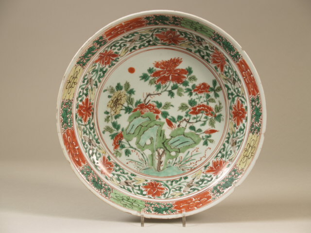 Schaal met polychroom decor van pioenroos achter rotspartij (Nederlands)