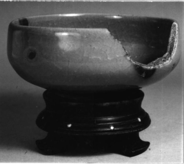 Wierookbrander met blauwgrijs glazuur met paarse vlekken, yunyao, met voetstuk van hout. (Nederlands)
