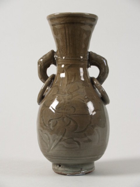 Vaas met 2 handvatten in de vorm van olifantskoppen waardoor ringen en met een ingesneden decor van bloemen (Q25778)