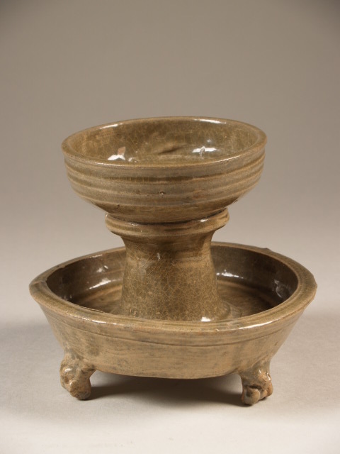 Olielamp celadon glazuur. Een bakje met horizontale strepen op een verhoogde voet staat in een (iets vervormde) bak op drie pootjes. De pootjes zijn in de vorm van dieren of dierenkoppen? Op de onderkant van de bak zitten drie proensporen. Yue-celadon. Dit object is waarschijnlijk vervaardigd in Zhejiang in één van de Yue-ovens. (Nederlands)