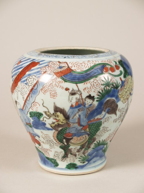 Vaas beschilderd in onderglazuur blauw en over het glazuur in rood, aubergine, groen en geel. Over het gehele oppervlak ...ere figuren met attributen. Wucai De hals van de vaas is ooit afgesneden.||China||Keramiekmuseum Princessehof GRV 1929-154 |