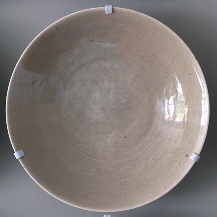 Schotel van porselein, bedekt met een grijsgroen glazuur. Versierd met een ingegrift decor, met op het plat een opspring...tring. Zhangzhou (Swatow)||Zhangzhou ware (voorheen bekend als swatow)||Zhangzhou||Keramiekmuseum Princessehof GRV 1929-156 |