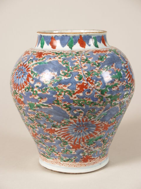 | Nederlands | Pot met decor van lotusbloemen en krullende ranken |