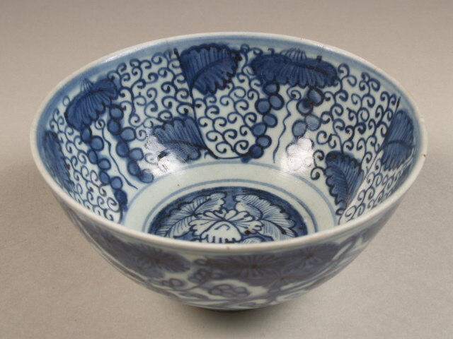 Kom met decor van pijnboomtakken aan de buitenzijde en druivenranken aan de binnenzijde (Nederlands)