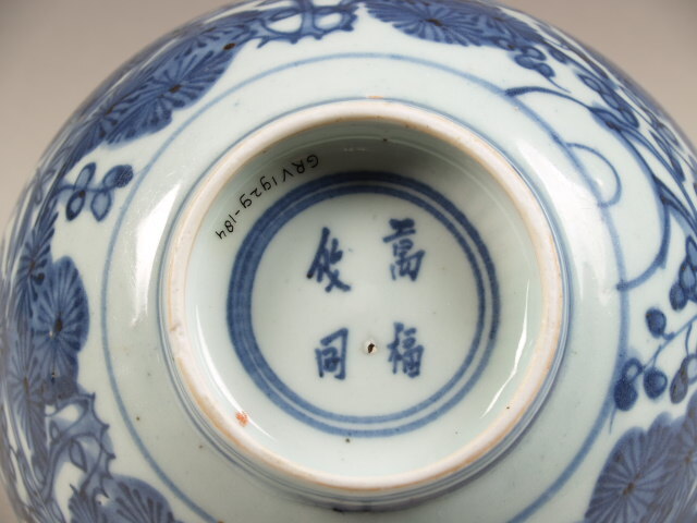 in kobaltblauw op de bodem in dubbele ring de gelukwens "wan fu yu t'ung" (a myriad happinesses embrace all (your affairs): Hobson I 225) (Nederlands)