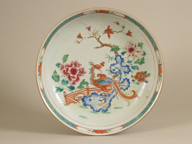 | Nederlands | Schaal met decor van feniks in landschap met bloemen, famille rose |