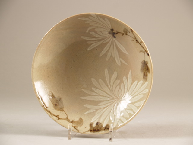 | Nederlands | Schaal met decor van 2 grote bloemen in ijzerbruin en wit slib |