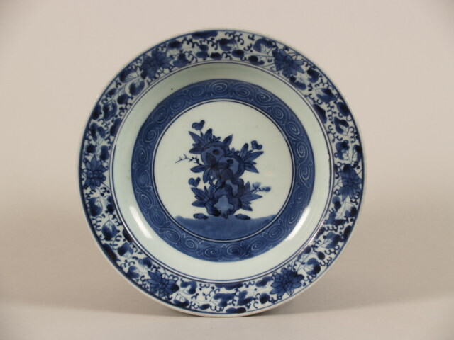 Bord in onderglazuur blauw. Op het plat een decor van een bloeiende granaatappelplant op een rots, binnen een kader met een krullend motief.. Op de rand een kader met daarin bloeiende ranken en zes bloemen. Op de achterkant vier biezen. (Nederlands)