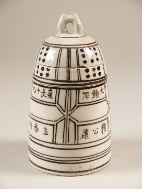 Fles met deksel in de vorm van een antieke klok met decor van lijnen en karakters (Nederlands)