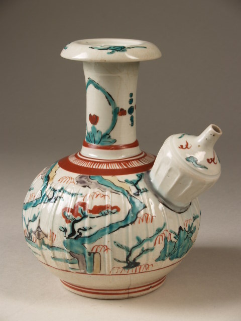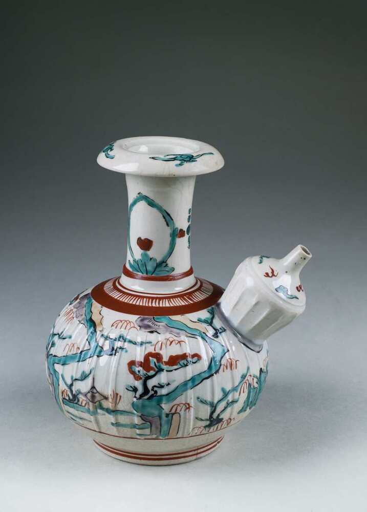 Kan op een voetring in de vorm van een kendi gedecoreerd in rood, geel, zwart en groen emails. Op de buik bevindt zich een landschap met bomen, huizen, planten, rivieren en bergen. Op de hals staan aan weerszijden tulp in een puntige boog afgebeeld. Op de rand van de hals is zijn vlammende/ruyi-wolken aangebracht, net als op de tuit van de kenid. De kendi is een typisch product voor export naar de zuidoost Aziatische markt. Het diende oorspronkelijk in rituelen, maar later ook voor dagelijks gebruik om water uit te drinken. In deze periode was de uitvoer van Chinees porselein beperkt door interne strubbelingen in China. Japan sprong in op het gat in de markt en begon met de productie van porselein voor de export, waaronder naar de zuidoost Azië. Deze kendi is daar een goed voorbeeld van. (Nederlands)