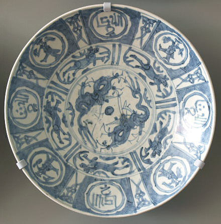 Schotel met decoratie in onderglazuur blauw. In het plat bevinden zich twee draken en een parel met daaromheen vakken gevuld met vliegende paarden. De wand is opgedeeld in verschillende vakken gevuld met afwisselend dansende mannen of Arabisch schrift met de betekenis "Allah is welzijn" en "God is heilzaam". Tussen de vakken bevinden zich symbolen. Zhangzhou ware (voorheen bekend als swatow) (Nederlands)