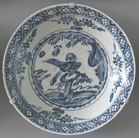 | Nederlands | Schotel met decor van papegaai op rots in landschap, Swatow |