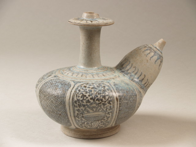 Kendi op voetring gedecoreerd in onderglazuurblauw. De buik is verdeeld in acht panelen afwisselend gevuld met een geome...éhandel, zowel Thailand als Vietnam sprongen in op het gat in de markt.||Thailand||Keramiekmuseum Princessehof GRV 1929-328
