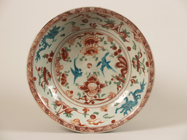 | Nederlands | Schotel met decor van vogels en florale motieven en op de rand draken |