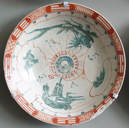 Schotel met in het centrum een Chinees maritiem kompas. In het midden was waarschijnlijk 'Tai ji' (太極) aangebracht, maar.... De decoratie is aangebracht in turkoois en rood. Zhangzhou (Swatow).||Zhangzhou||Keramiekmuseum Princessehof GRV 1929-339 |