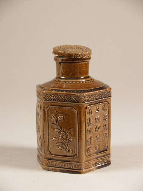 Theebus, zeshoekig, okerkleurig gelazuurd, met reliëfdecor van bloemen en opschrift (Nederlands)