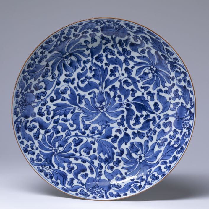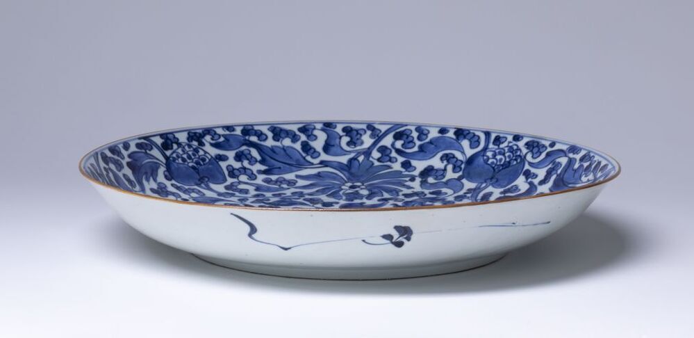 Schaal met licht convexe bodem, v-vormige voetring, s-vormig spreidende wand. Versiering: in blauw onder glazuur, vegetaal ornament over de hele binnenkant. Buitenkant enkele summiere takken.||China||Keramiekmuseum Princessehof GRV 1929-400