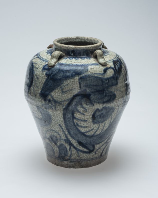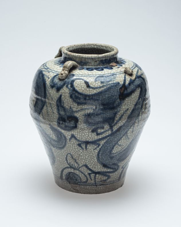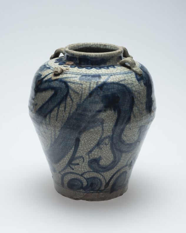 Pot met platte bodem en rechte voetring. Baluster-vormige pot, op de schouders vier radiale lusoortjes. Brede mond m. re... Over de hele buik heen twee slangachtige draken, en een paddenstoel.||Zuid-China||Keramiekmuseum Princessehof GRV 1929-409 |