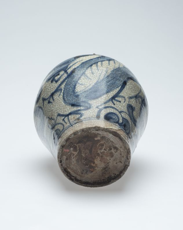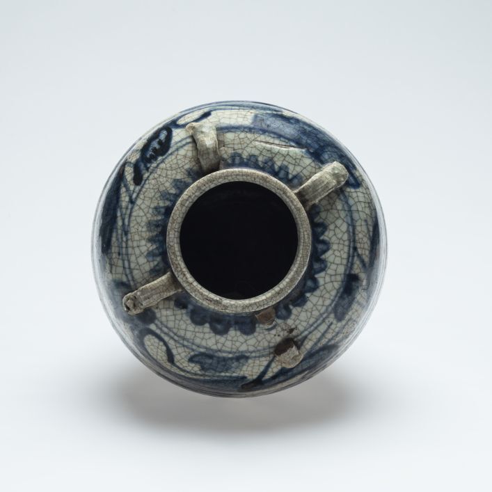 Pot met platte bodem en rechte voetring. Baluster-vormige pot, op de schouders vier radiale lusoortjes. Brede mond m. rechte rand en verdikte lip. Versiering: in blauw kobalt, helder en ongestoord door luchtbellen. Over de hele buik heen twee slangachtige draken, en een paddenstoel. (Nederlands)