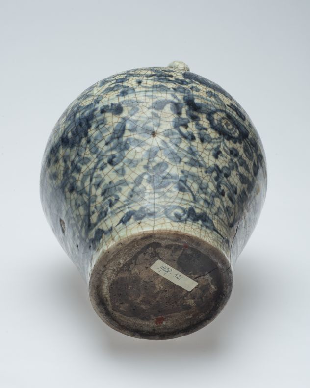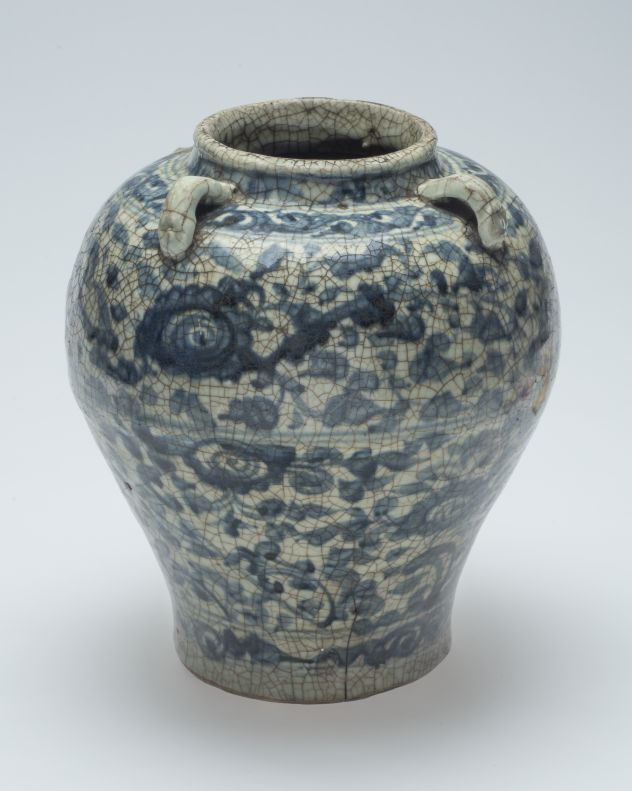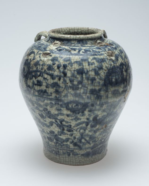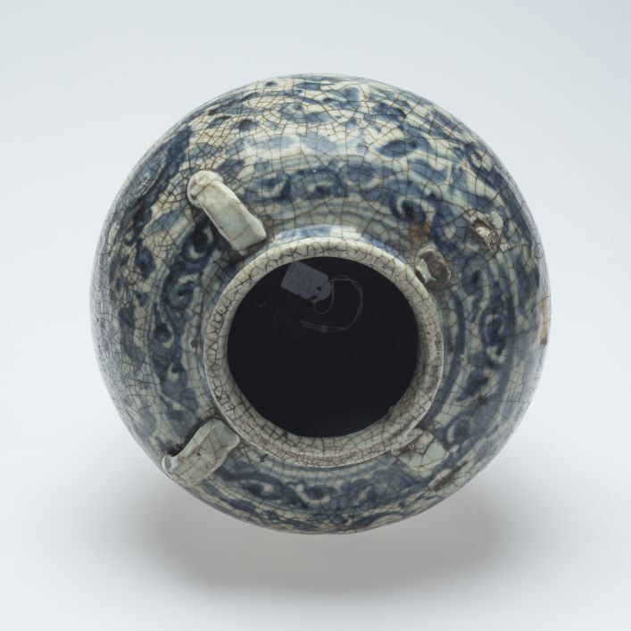 Pot met vlakke voet, krachtige voetring. Balustervormige wand, boven op de schouder vier radiair geplaatste bandoren met... lage hals met verdikte lip. Versiering: oak leaf achtige bladranken.||Zuid-China||Keramiekmuseum Princessehof GRV 1929-410 |