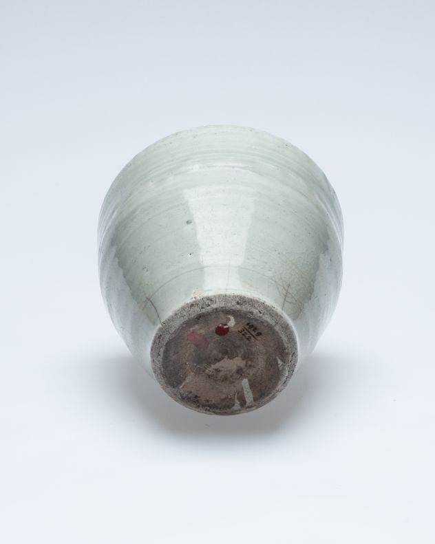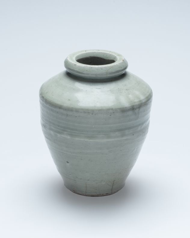 Pot met concave voet, schijnvoetring. Bolspreidende wand, scherp knikkende, dan bijna recht verjongende schouder, korte rand, dikke lip.||China||Keramiekmuseum Princessehof GRV 1929-413