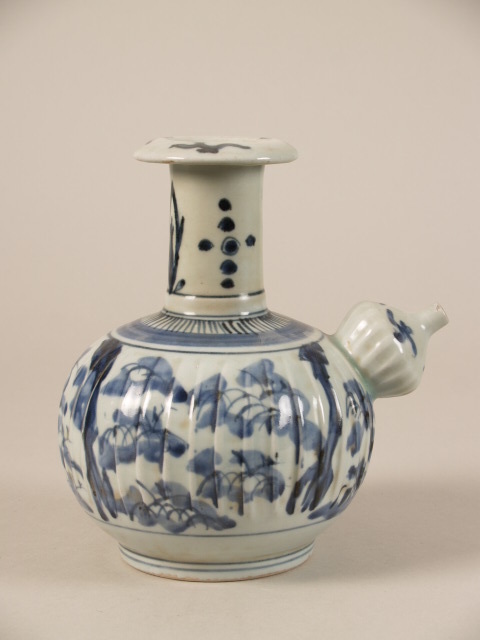Kendi met decor van landschap en van vertikale randen in reliëf (Nederlands)
