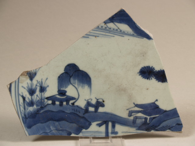 Scherf van schaal met decor in onderglazuurblauw van 2 figuren op brug (Nederlands)