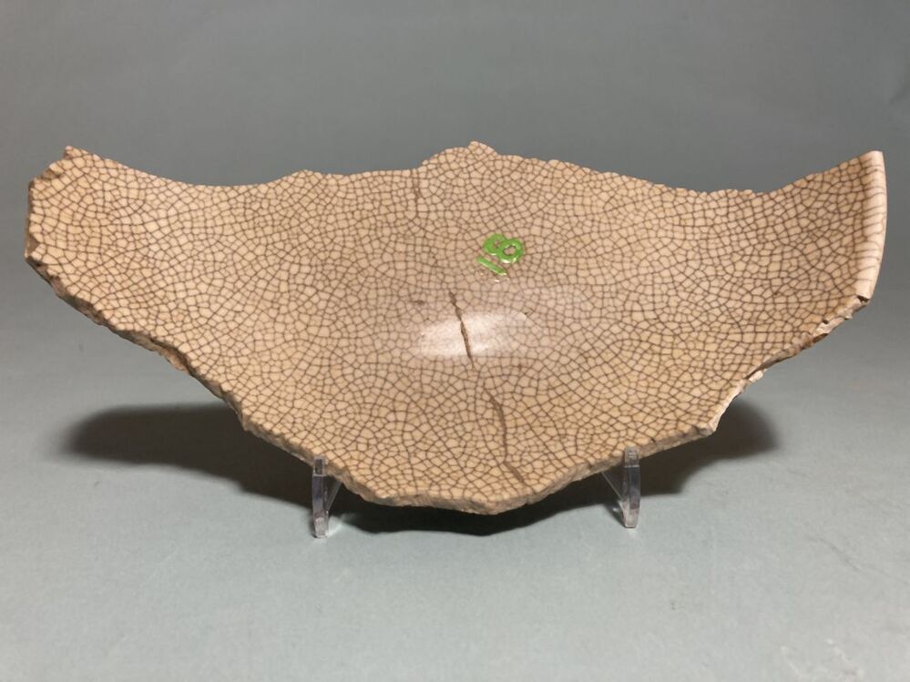 Fragment van een schaal met dik gecraqueleerd grijs glazuur. (Nederlands)
