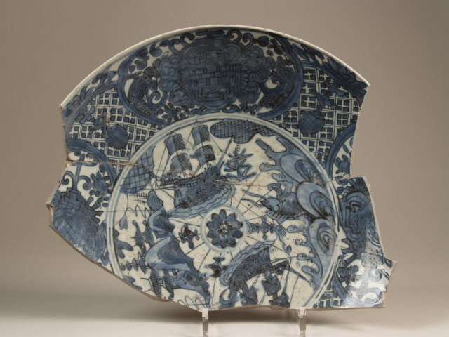 Scherf van schaal met decor van Europese schepen, Swatow (Nederlands)