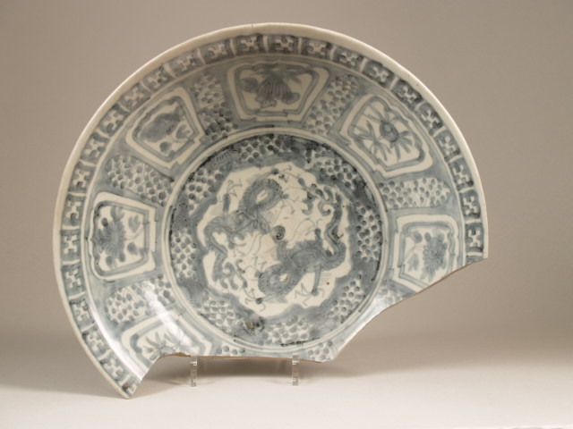 | Nederlands | Scherf van een schaal met decor van 2 draken en vakken met bloemtakken, Swatow |