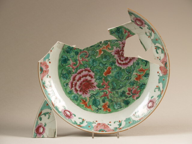 | Nederlands | Twee delen van een bord, beide bestaande uit aan elkaar gelijmde scherven van schaal met decor van bloemen, famille rose |