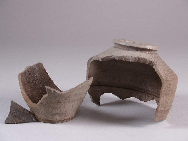 Scherf van pot, 3 stuks, lichtgrijs steengoed voorzien van kleurloos glazuur (Nederlands)