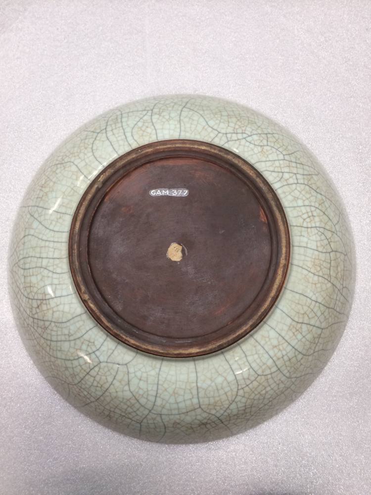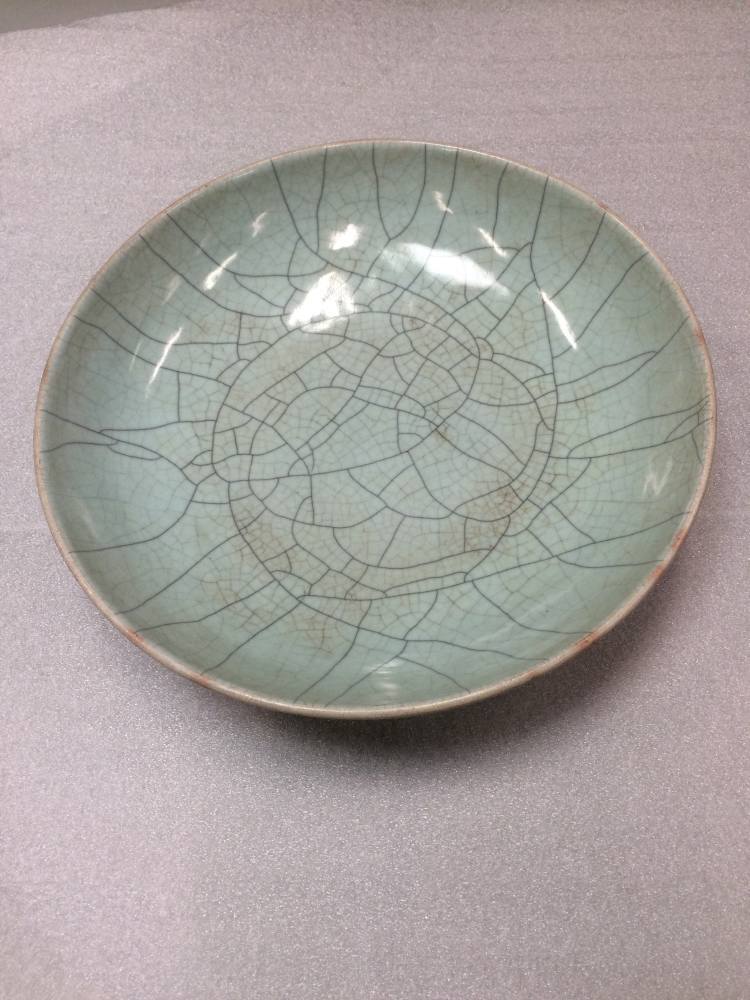 Schaal met zwaar gecraqueleerd celadon glazuur, de ongeglazuurde bodem ongeglazuurd (Q26215)