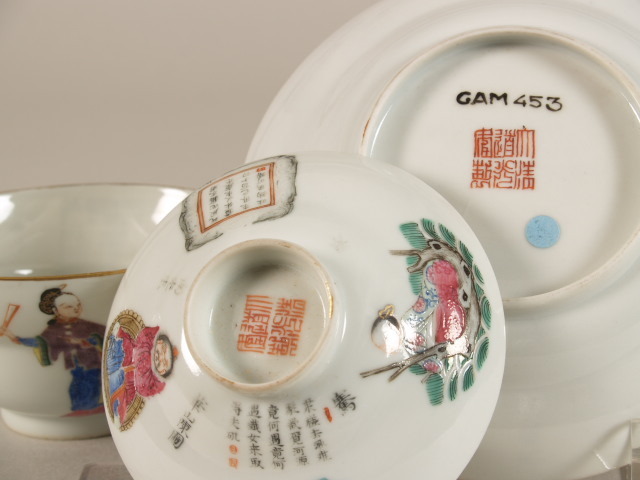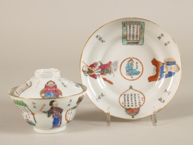 | Nederlands | Kop en schotel met deksel en decor van figuren en karakters, famille rose |