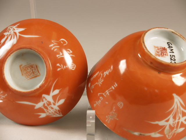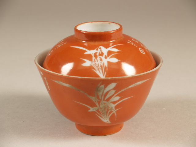 Soepkom met deksel bedekt met ijzerrood glazuur en uitgespaarde bamboeversiering en karakters (Q26260)