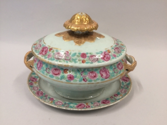 Terrine met deksel, onderschotel, vergulde knop en handvaten en decor van bloemen in emails famille rose (Nederlands)