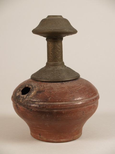 | Nederlands | Kendi van rood aardewerk met messing top |