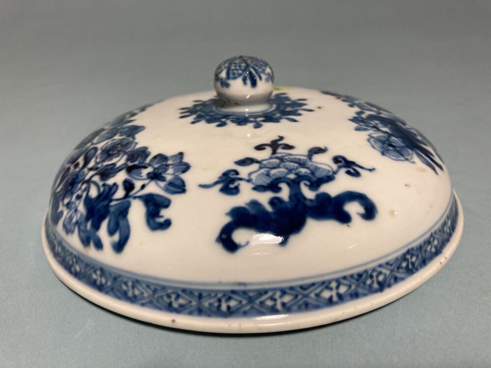 Deksel met decor van bloemen en bladeren in kobaltblauw. (Nederlands)
