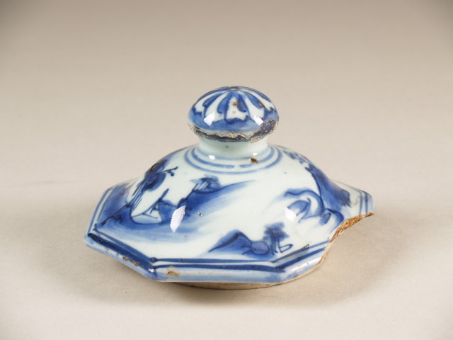 | Nederlands | Deksel, achthoekig met decor van landschap, overgangsporselein |