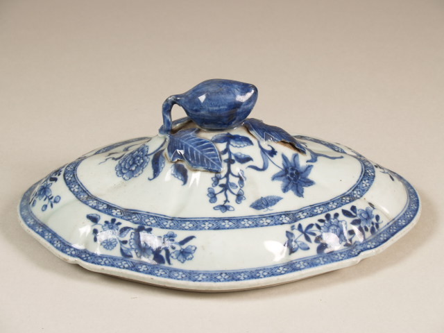 | Nederlands | Deksel, ovaal, met perzikvormige knop en decor van bloemen |
