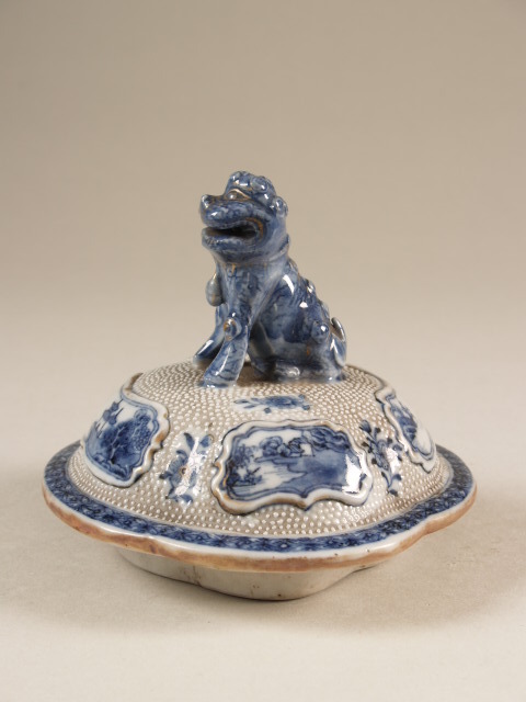 | Nederlands | Deksel, ovaalvormig, 4 maal geschulpt met knop in vorm van leeuw, met decor in reliëf van landschappen |
