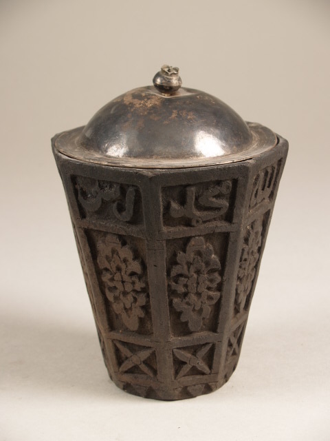 Kalkpot met zilveren deksel, achthoekig met reliëfdecor (Nederlands)