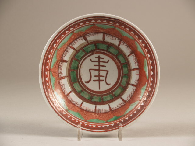 Bord gedecoreerd over het glazuur met rood en groen. In het plat een karakter (shou) en daaromheen tot aan de rand van het bord verschillende banden met abstracte motieven. Het geheel stelt een bloem voor. De onderzijde is ongedecoreerd en de voetring is ongeglazuurd. (Nederlands)