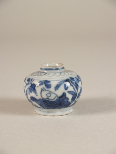Potje met decor van cartouches met daarin een opspringende karper (Nederlands)