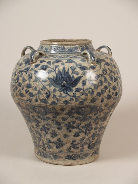 Voorraadpot met handvatten en decor van krullende bloemranken (Nederlands)